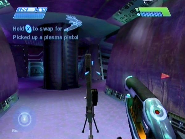 Armed with a sniper rifle and pistol, run past the platform, right up to the far end of the area, and enjoy some sniping. The pistol has enough range for enemies on the platform, and is also handy for stopping any Flood heading your way. Most of the time you'll be unaccosted though. If you move to the edge of the catwalk, you can just see where the Flood land.
