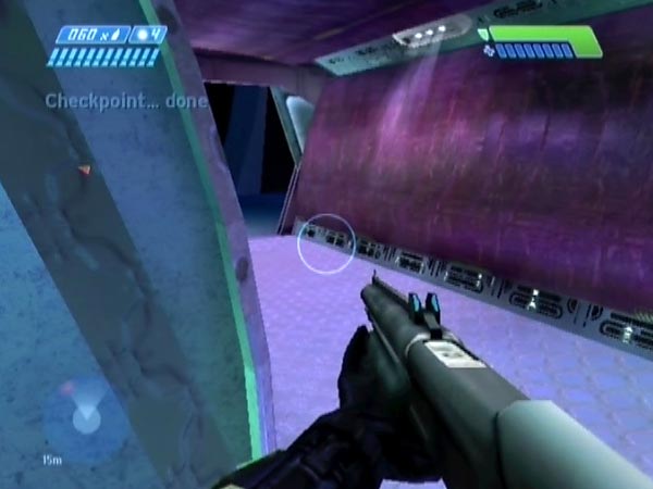Also get the sniper rifle along the way. With the camo it's possible to reach almost all the way to it without being held up, if you want to. There's no extra ammo for it (as far as I know), so save its 18 rounds for the hangar battle. Preferably also save your frag grenades, in case later Flood don't drop enough to allow you to stock up fully for the battle. Continue on and reboard the ship.